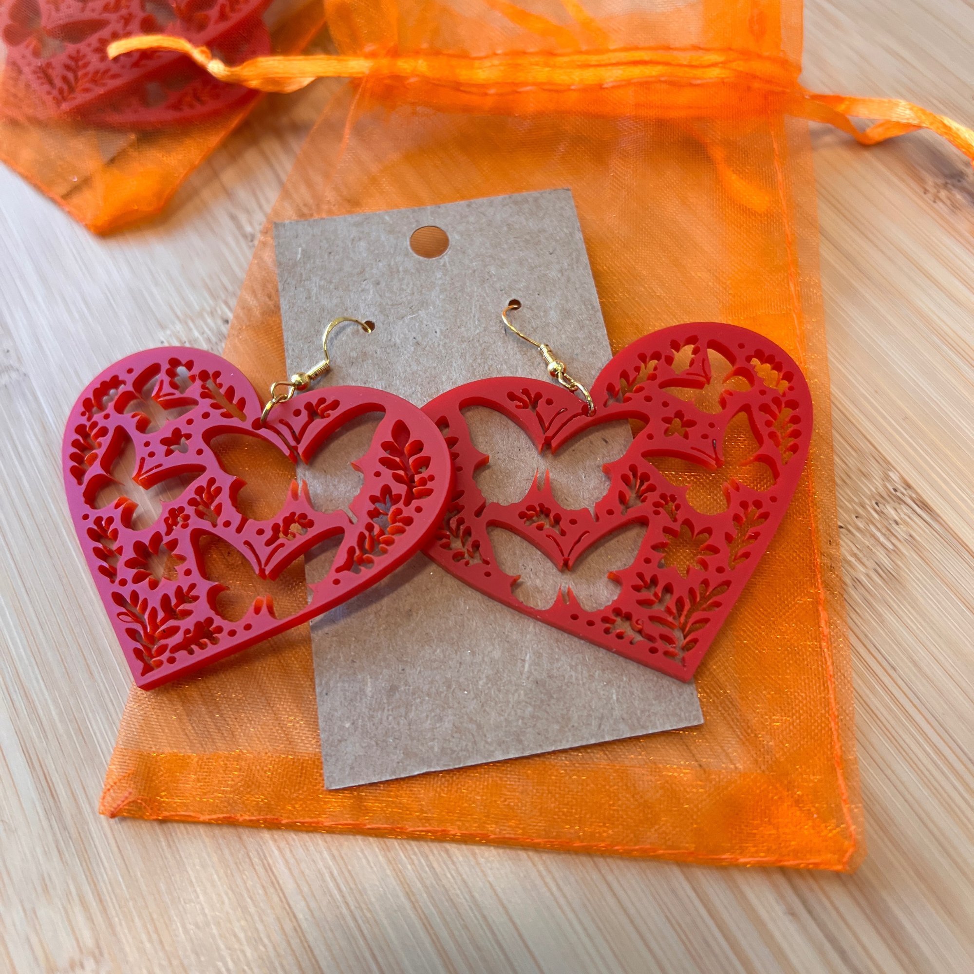 These red acrylic earrings with intricate butterfly and floral cutouts are lightweight and add joy to any outfit.